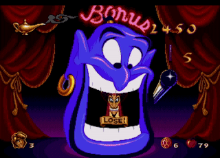 If Aladdin loses, then the game is over and he will be returned to the same spot he left on the map, and will be invincible for a few seconds (this sequences will also occur after the third play of the game regardless of who wins). If Aladdin wins, the screen will show in graphical (as seen if they were being picked up in the regular game) and/or text (if extra score) form, what he has won.