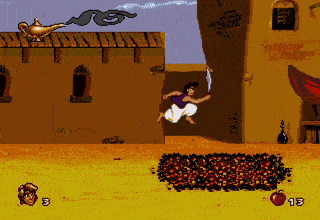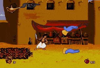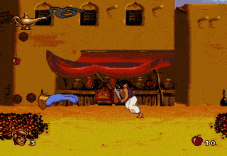 • A man would sometimes appear laying on a bed of nails obstacle in the CD version, allowing Aladdin to jump off of him once without being harmed. After being jumped on once, gets up “in disgust” and can no longer be used as a stepping stone.
