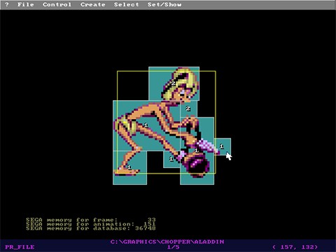 Chopper is a wholly-proprietary interface-driven tool, which works off of its own sprite database format. It was principally developed by Andy Astor, but looks to have been touched by quite a few hands. This includes David Perry, who specified the Genesis output format. Unfortunately, Chopper’s source code is not included in the archive, so our visibility into its development is limited to accompanying documentation.