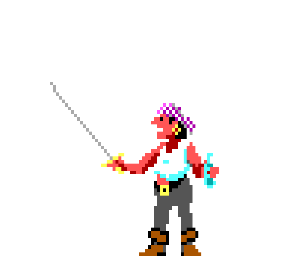 Meet Proto-Guybrush! This early design for the character sported a red sash and brown boots, and was a little bit shorter and squatter. Here’s a fun fact: when you’re on an overhead map in the final version of the game, Guybrush is reduced to a four pixel sprite, the third of which is red – a leftover from this old design!