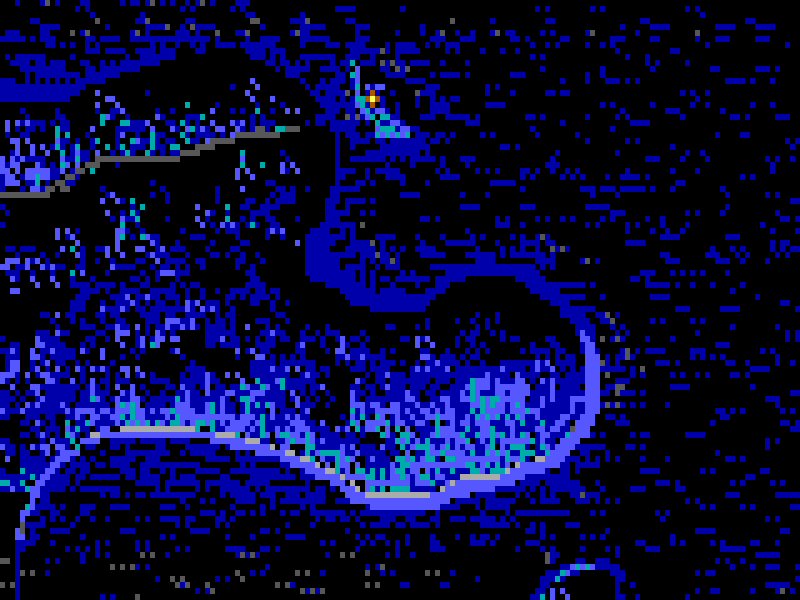 This is the art file for an unused room in the game…or rather, nine unused rooms. The slices of shorelines on the right would be placed over the blank blue image on the left in code, depending on where the player was. It appears that the game design at one point allowed Guybrush to row onto the open sea, away from the island (or perhaps the inverse – Guybrush would approach the island from the open sea).