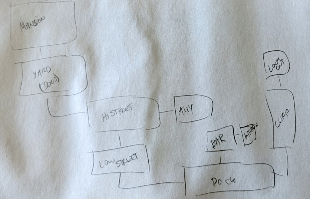 This sketch from Gilbert’s notebook shows ideas for the interior of the mansion, including the aforementioned puzzle involving ants. Unused code also suggests a hallway room not mentioned here, as well as six hallway doors. Perhaps the hallway doors – like the final game’s Low Street doors – would connect randomly, as a clever reference to a Scooby-Doo trope?