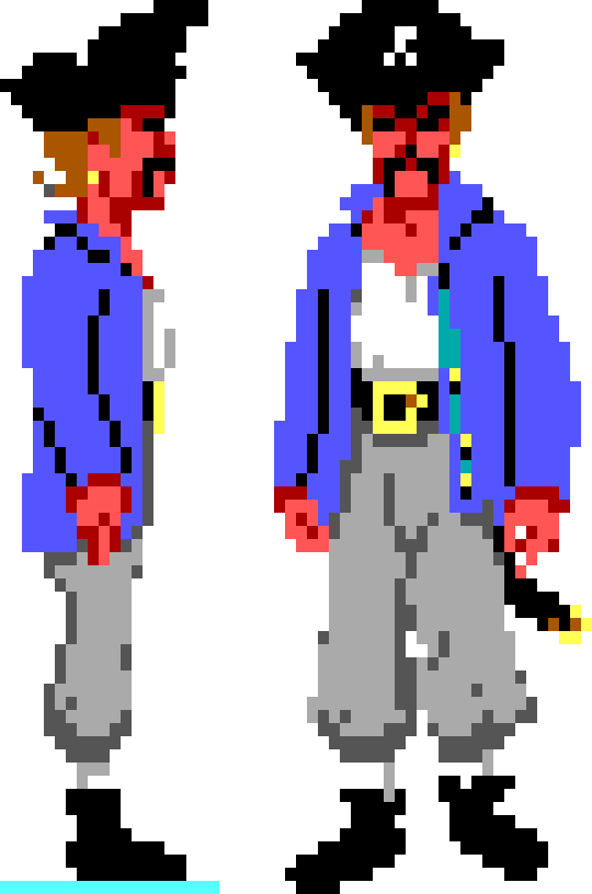 Meet Proto-Guybrush! This early design for the character sported a red sash and brown boots, and was a little bit shorter and squatter. Here’s a fun fact: when you’re on an overhead map in the final version of the game, Guybrush is reduced to a four pixel sprite, the third of which is red – a leftover from this old design!